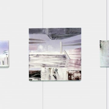 Niculescu’s paintings are a continuation of the “Less is more” series. She is going deeper beyond unnecessary details through a moral and ethical view. This (reminding of the dry desert or the frozen lonely north) in a spiritual search for authenticity and freedom. Right from the first works of this series, facades are uncovered. By then, the structures are demolished. All limits go away, the basement is erased and time fly away.